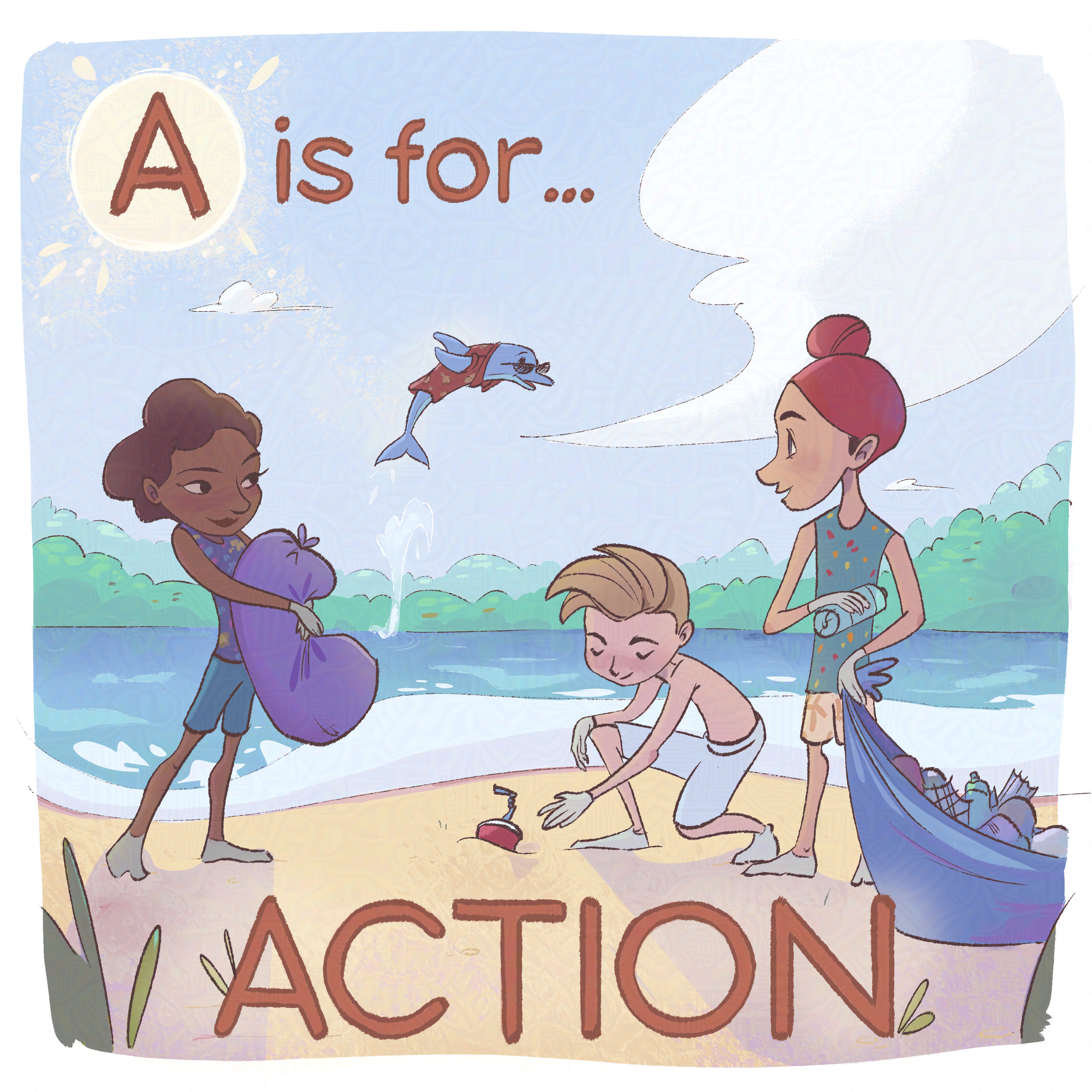 A colorful illustration of children cleaning up a beach, with some holding trash bags, one person grabbing trash from the sand, and another holding a trash bag with collected litter, all with the text 'A is for...' and 'ACTION' at the bottom.